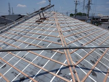 下地の改質アスファルトルーフィングという防水シート、桟木、防災棟金具を取り付けていきます。